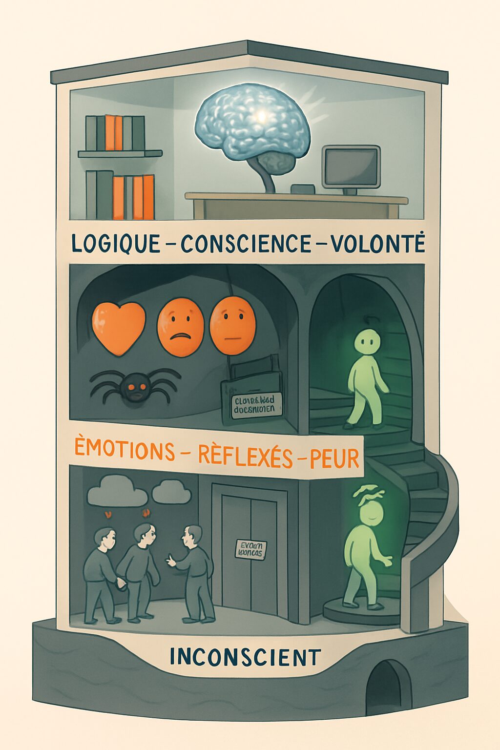 - L’étage conscient (cortex préfrontal) : C’est là que vivent votre logique, votre raisonnement, votre volonté. Cet étage « sait » que les araignées ne sont pas dangereuses.